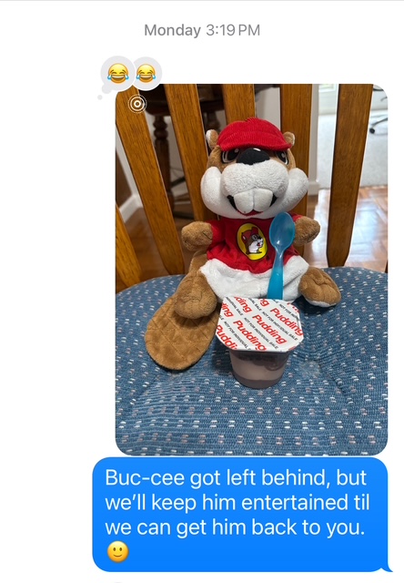 5. Grandson fun. Timothy accidentally left his Buc-cee’s Beaver puppet in Granddad’s camper. We were going to take it when we went to their house for his birthday, but forgot. So I sent them this text: