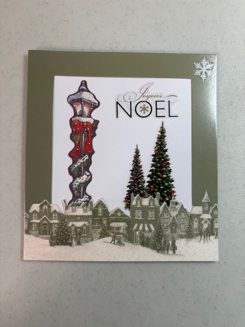 This was Jim’s Christmas card. I loved this frame that came with a packet of Christmas scrapbooking materials. I’m wishing I had done something a little different with the middle part of it. But he liked it. 🙂 The trees, snowflake, and words were stickers. The lamppost was in the same packet as the frame.