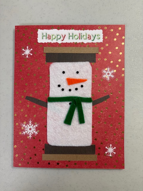 This was Timothy’s, also adapted from a Pinterest find. It’s supposed to look like a s’more with a snowman marshmallow. The snowman was cut freehand from stick-on felt. The arms, nose, chocolate, and graham crackers were cut freehand. The words and snowflakes were stickers. The eyes and smile were made from little stick-on beads, but they didn’t stick very well to the felt. I had to use dabs of Elmer’s glue.