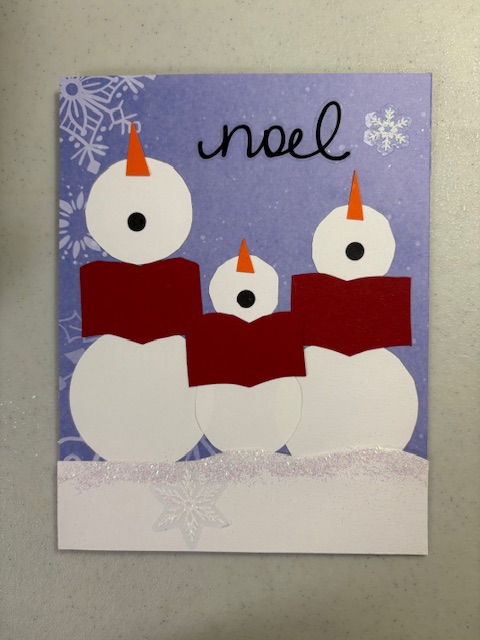 This was Jason’s, adapted from an idea seen at Pinterest. The “Noel” and a couple of the snowflakes were stickers. The song books and noses were cut out freehand. I used stencils for the snowmen bodies and heads and a hole punch for the mouths.