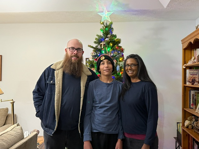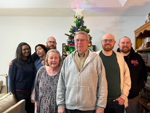 Bonus: Good news from a friend undergoing a kidney transplant. All went well with the surgery and his numbers have improved immensely the first day after. One of my simple pleasures is getting new wall calendars set up for the year. Jeremy made it to RI with no scheduling problems. Though we miss him already, his cat was glad to have him back. πŸ™‚ Jason and Mittu got me some much-needed larger plastic storage containers, unasked and unexpectedly (I think prompted by my sending soup home with them in the only large container I had which had a broken lid πŸ™‚ ). We finally got some family photos New Year’s Eve: