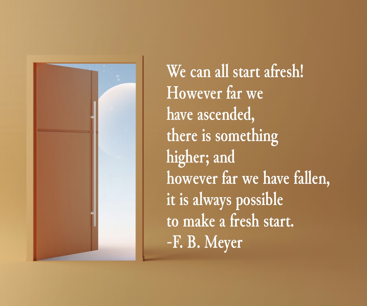 We can all start afresh! However far we have ascended, there is something higher; and however far we have fallen, it is always possible to make a fresh start. F. B. Meyer