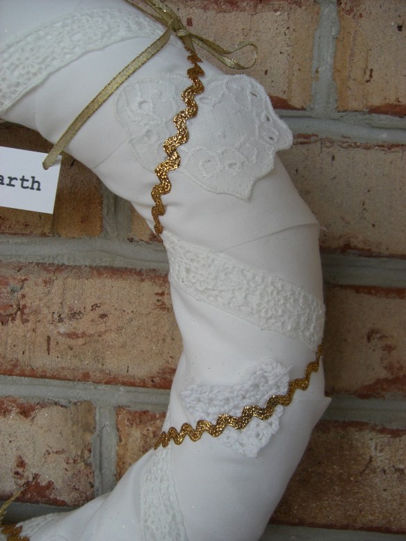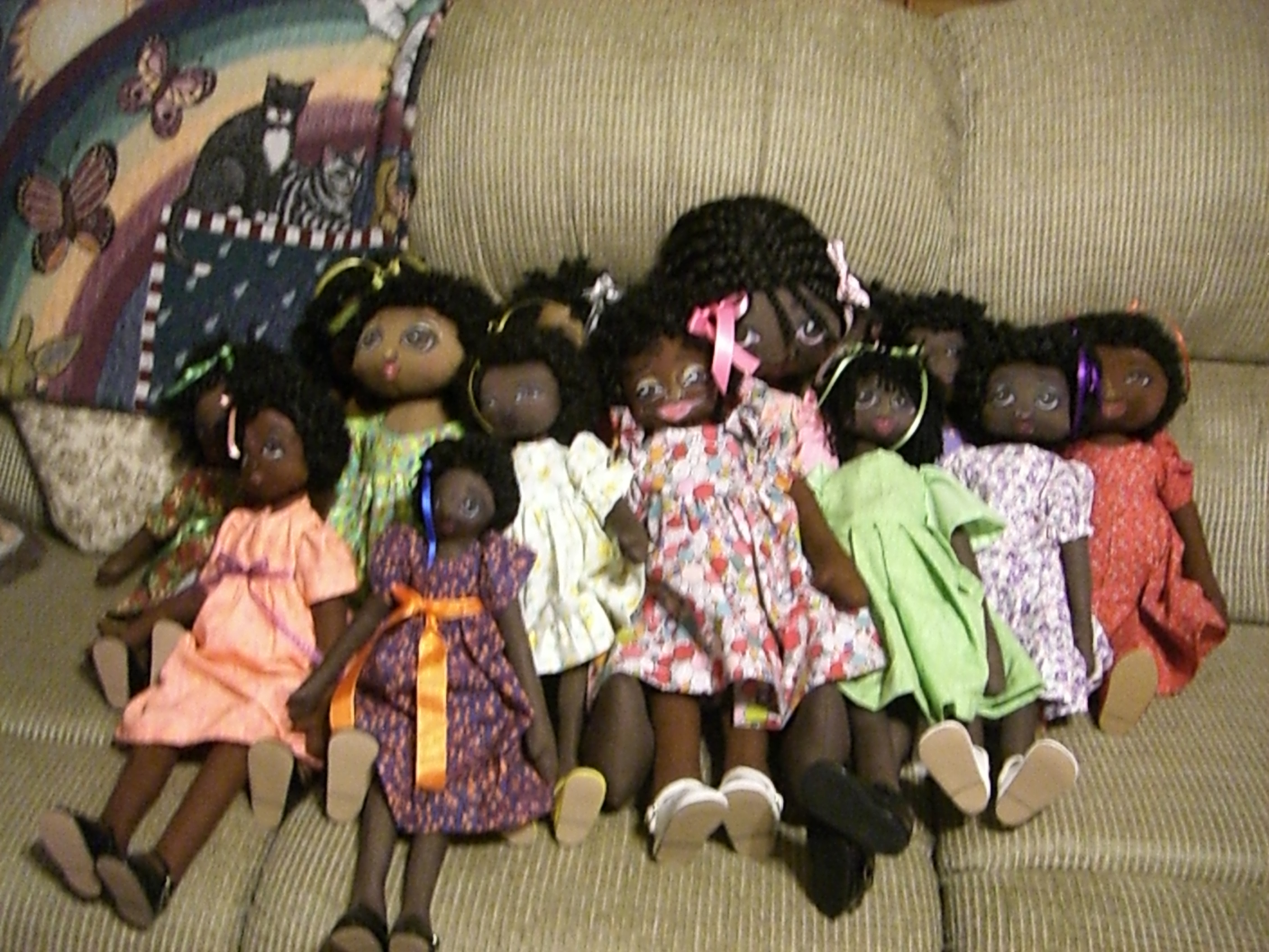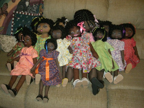 Then, one of the most exciting parts was a special presentation we made. There is a lady in our church who makes beauitful little dolls, and she put a few in our missions closet. When this family was here before, they asked of she made any in different colors. They said the little girls in their neighborhood in Ghana loved to come over and play with their girls’ dolls, putting them in the little sling-type thing that the African moms carried their babies in on their backs. So I asked this lady if she could make a few for us to give to them, thinking she might be able to make 3 to 5. She made 13! And at the end of the luncheon we were able to present them to our speaker. Here they are on my couch beforehand.