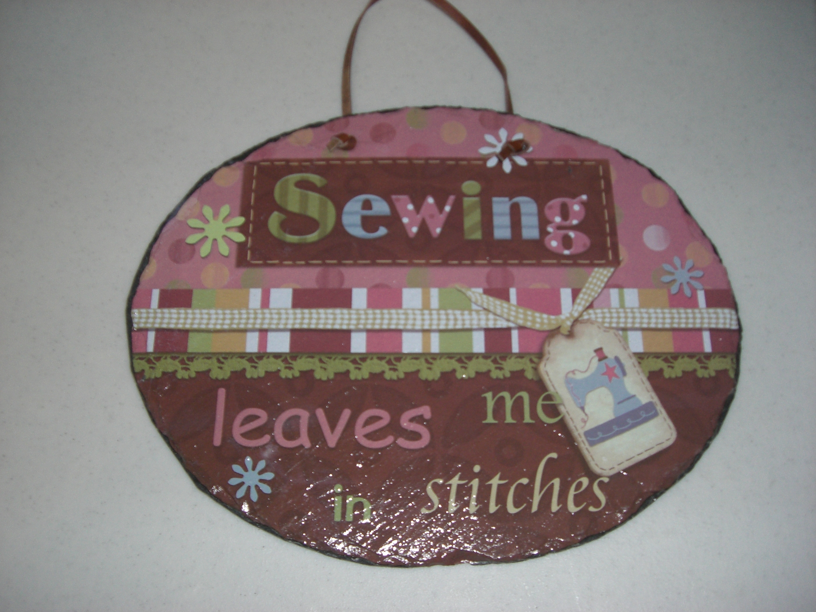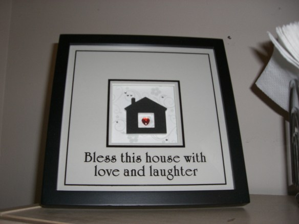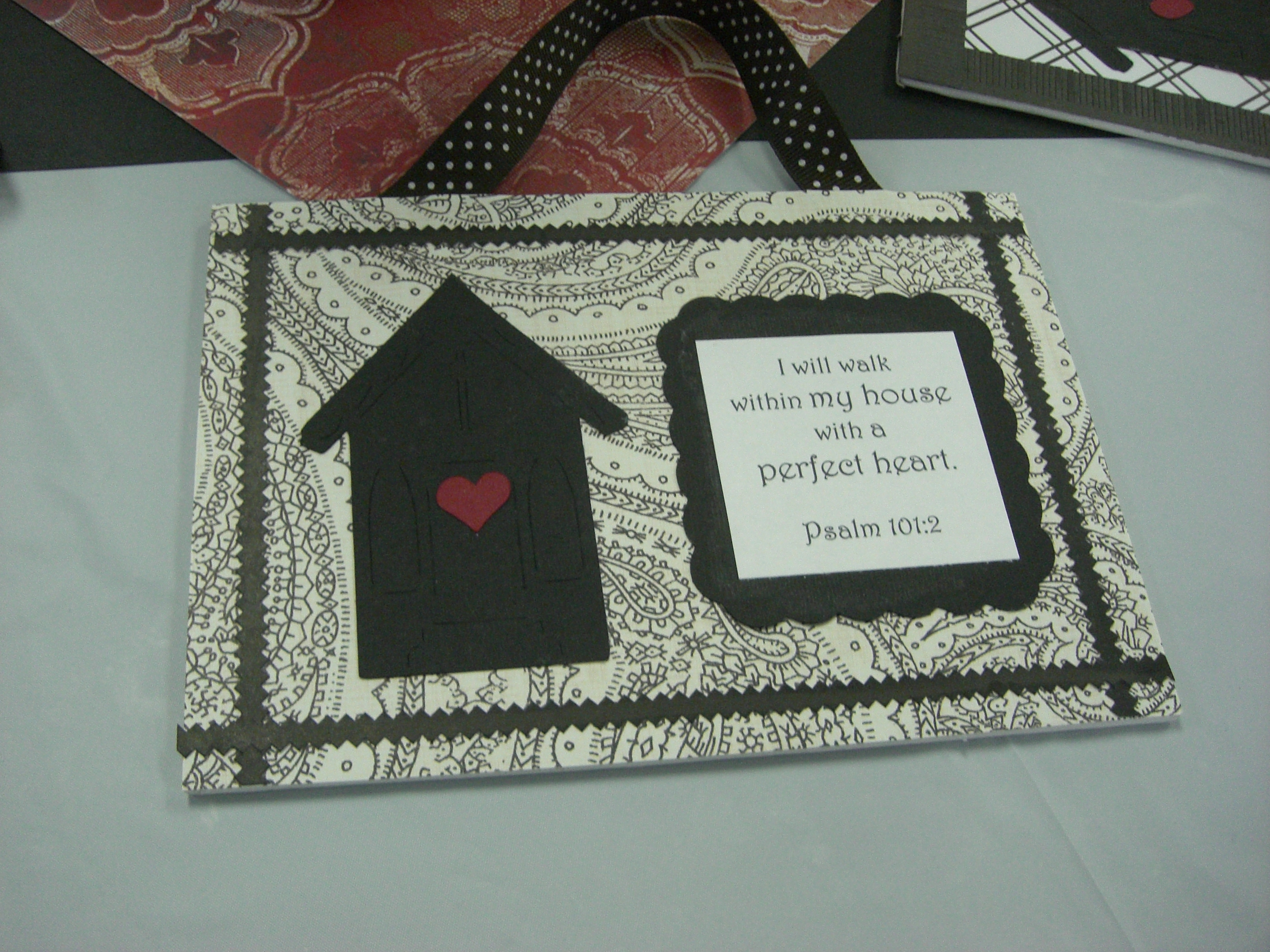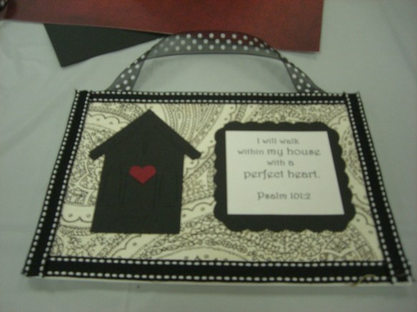 At our April ladies’ meeting, we made little plaques with black and white patterned scrapbooking paper as backgrounds and a little black house with a red heart and the theme verse. We used black and white patterned ribbon for hangers, and some of that as well as black pre-cut decorative edgings I found at Hobby Lobby for trim. We used a flat 5 x 7″ canvas in the art section of Hobby Lobby and Michael’s — they were about a dollar apiece at Michael’s and a little less at Hobby Lobby. It was so fun to see what the different ladies came up with using the different papers and ribbon. Here are a few of them: