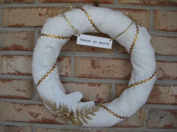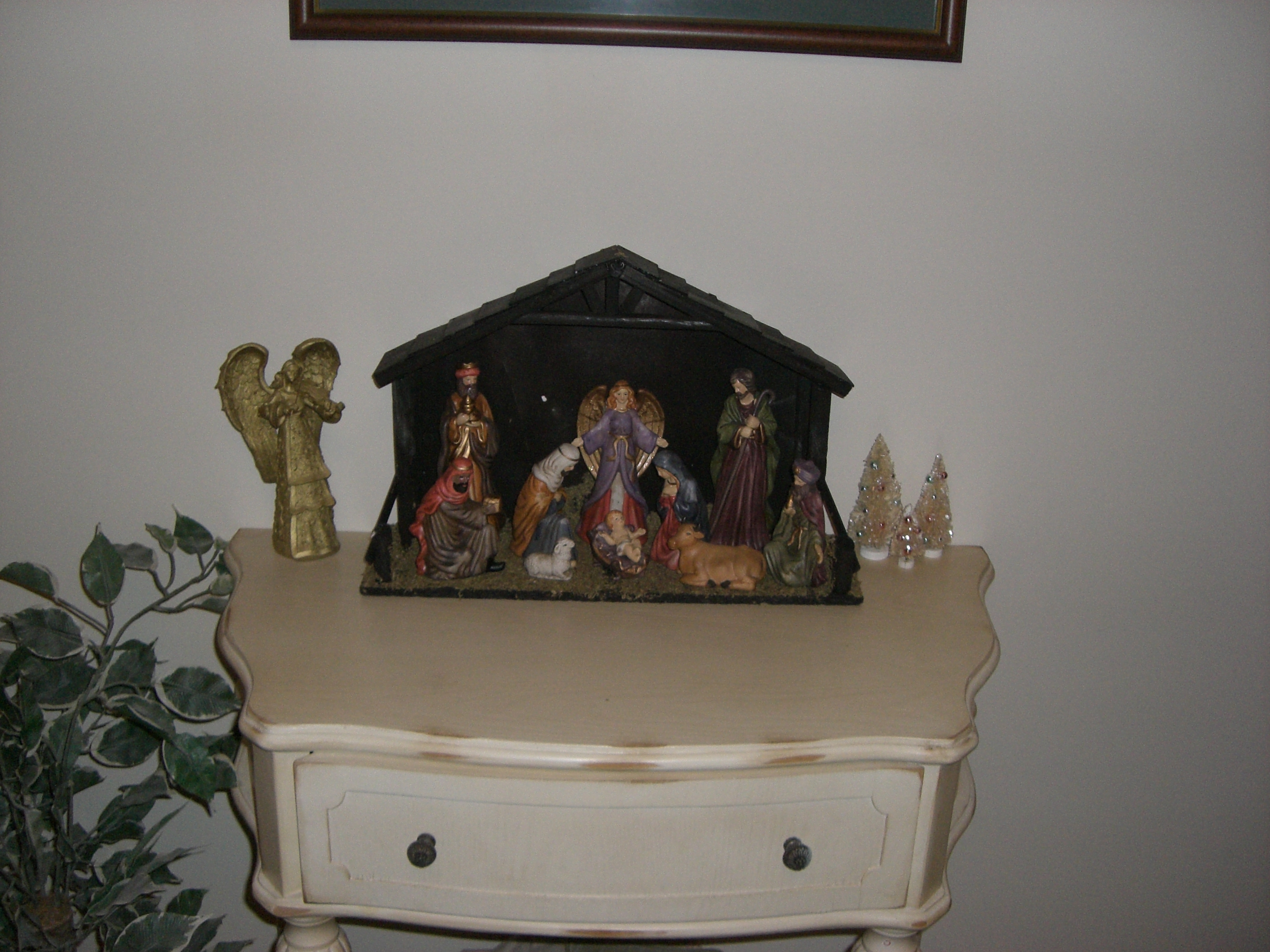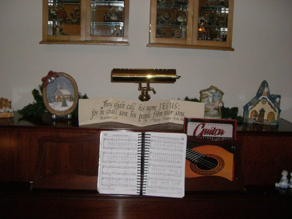 I ended up not using the little house from the plaque as a template — I wasn’t sure if that might be illegal or unethical. You can find some basic house shapes like this one online, but I looked through my Cricut cartridges to see if I had any that would do and ended up using the little church design from the Winter Wonderland cartridge and cutting off the steeple. 🙂 There were other little houses on the cartridge, but I liked that one best. (On a side note, I didn’t buy the cartridge just for this project — I already had it — and I didn’t pay that price: they frequently go on sale half-price here.) I also used the “blackout” feature (where it just cuts out the outer edges as a solid) of one of the snowflake designs for the background behind the verse. It was the first time I had really used the Cricut machine my generous hubby had given me some time ago — and now I want to use it all the more! With it, I was able to get everything cut out beforehand, so that at the meeting all we had to do was glue things together. If we’d had to have ladies cutting out things, it probably would have taken us more than one session.
