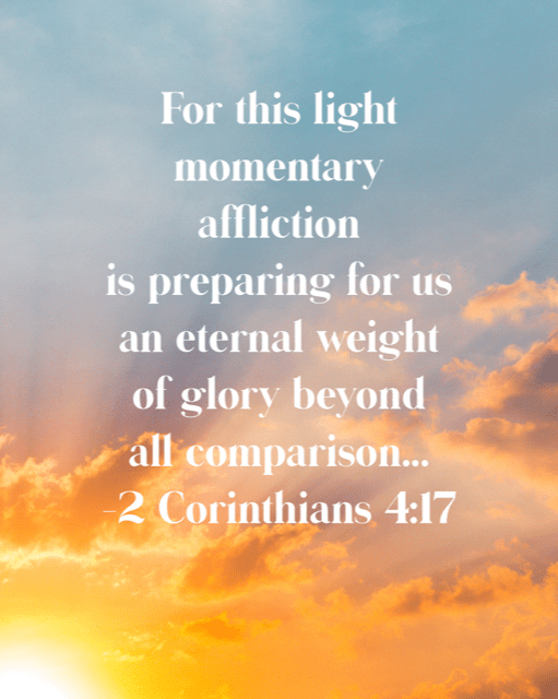 I admit I have wrestled with this one. When I was about 38, I read about the man who had been paralyzed for 38 years and imagined his being paralyzed my whole lifetime. Part of me wondered how God could ask this of him. But 38 years is not that long compared to eternity. Paul said, “For this light momentary affliction is preparing for us an eternal weight of glory beyond all comparison, as we look not to the things that are seen but to the things that are unseen. For the things that are seen are transient, but the things that are unseen are eternal” (2 Corinthians 4:17-18). Paul didn’t use the word “light” lightly: he had been speaking of excruciating suffering earlier in the chapter. But compared to the “eternal weight of glory,” it was light.