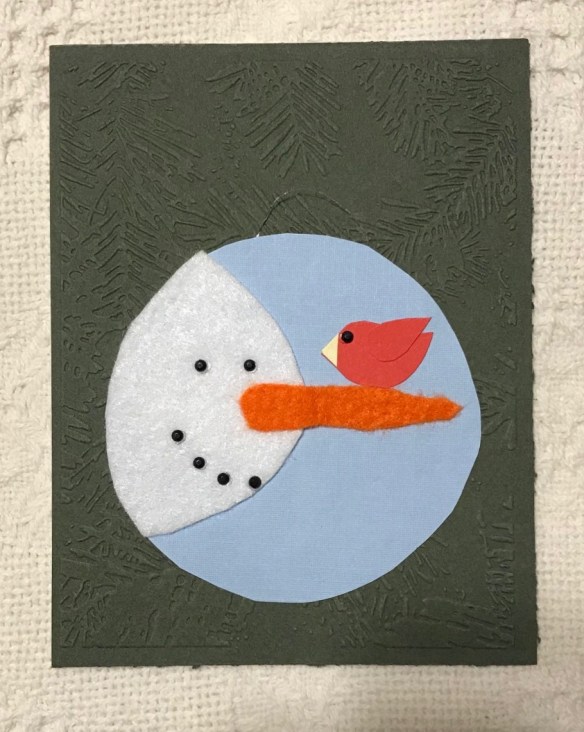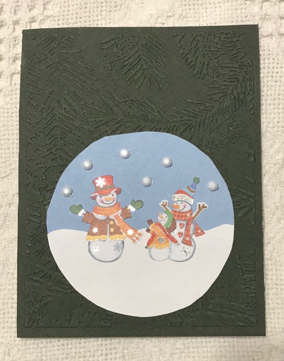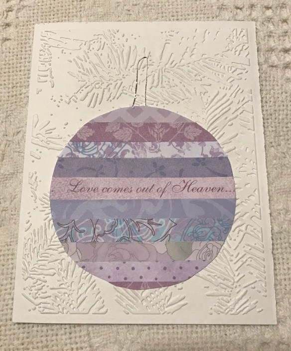 Going in chronological order, this was a card for a friend’s birthday. Only . . . I had the date wrong. I had it on my calendar and gathered a few things together and made her a card. Then the night before, I thought maybe I should check the church directory and make sure of her birth date. And I discovered it was in July, not February! I decided to go ahead and give everything to her since she’d probably get a kick out of it. We could almost call it her half-birthday. 🙂 Plus, I didn’t want to have to keep up with the things until summer. As it turned out, when I dropped the things off at her house, she had had a very draining couple of days. So an unexpected non-birthday gift was a day-brightener.