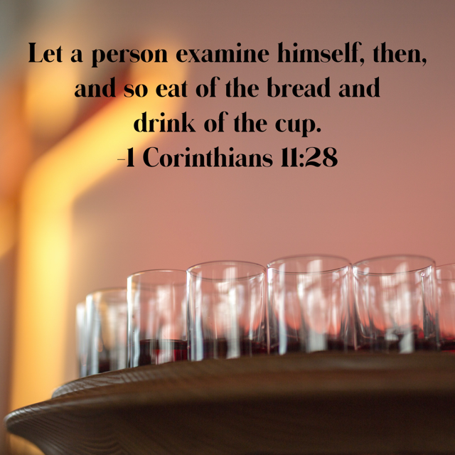 Self-examination is a good thing. But we don’t need to save everything up until communion time. We need to confess sin to God as soon as we’re aware of it and convicted by it. I have become more and more aware that we all have blind spots. Jesus warned people about looking for specks in other people’s eyes when they had big logs in their own. God told people in Malachi what they were doing wrong, but they denied there was a problem. He told the church in Laodicea, “For you say, I am rich, I have prospered, and I need nothing, not realizing that you are wretched, pitiable, poor, blind, and naked” (Revelation 3:17). I’ve been regularly asking the Lord to show me my own blinds spots. When we’re seeking to walk closely with Him every day, asking Him to show us where we fall short, confessing sin to Him as we become aware of it, we won’t need extremely long periods of self-examination before we’re right with God.