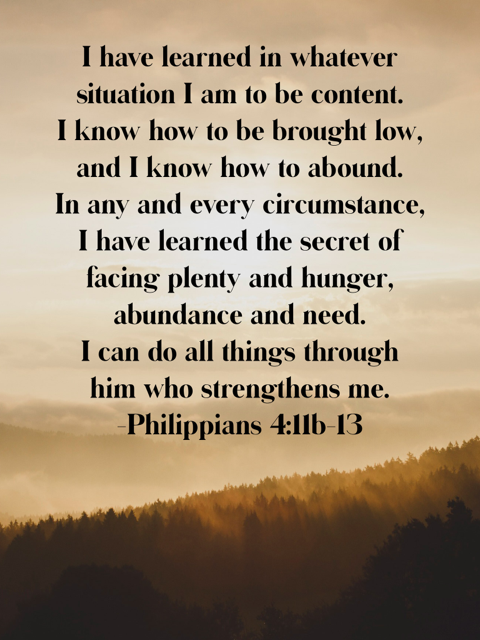 I think of Philippians 4:11-12, where Paul says, “I have learned in whatever situation I am to be content. I know how to be brought low, and I know how to abound. In any and every circumstance, I have learned the secret of facing plenty and hunger, abundance and need.”