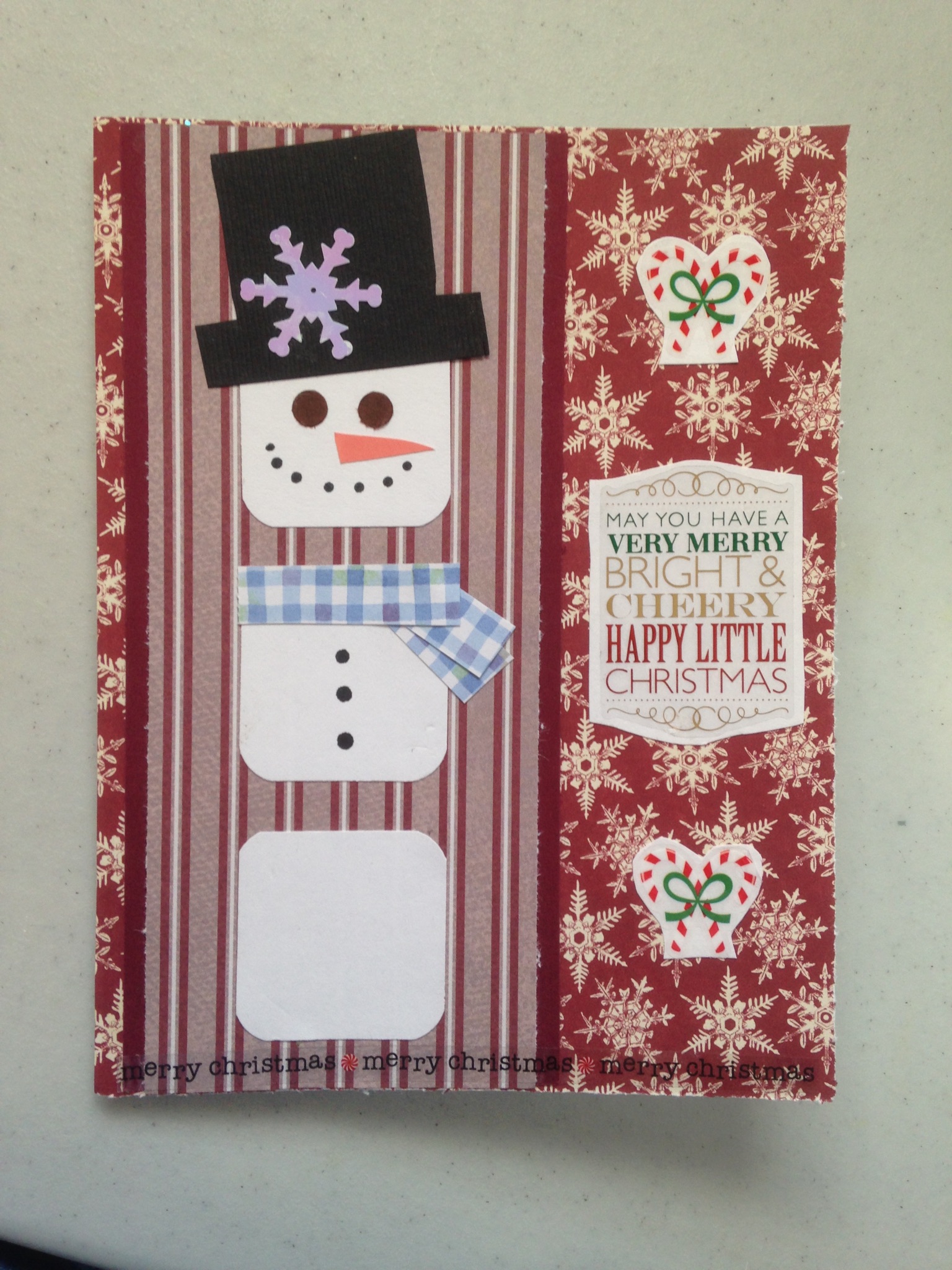This is another Pinterest inspiration. I think I did it all freehand except the snowflake. And the dots for the mouth were probably from a punch. “Merry Christmas” was a sticker put on cardstock, then trimmed following the shape of the letters.