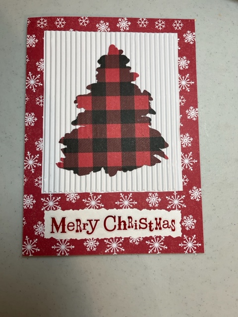 The tree was done with the Cricut, but could easily be cut out by hand. The “Merry Christmas” was another sticker placed on white cardstock and cut with decorative scissors.