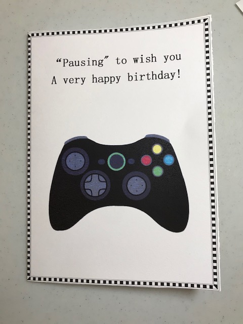 This was for Jesse’s birthday. Video games are his main thing, and I looked for some kind of video game clip art. When I found this controller, I decided just to make the card on the computer rather than printing and cutting out the pieces.